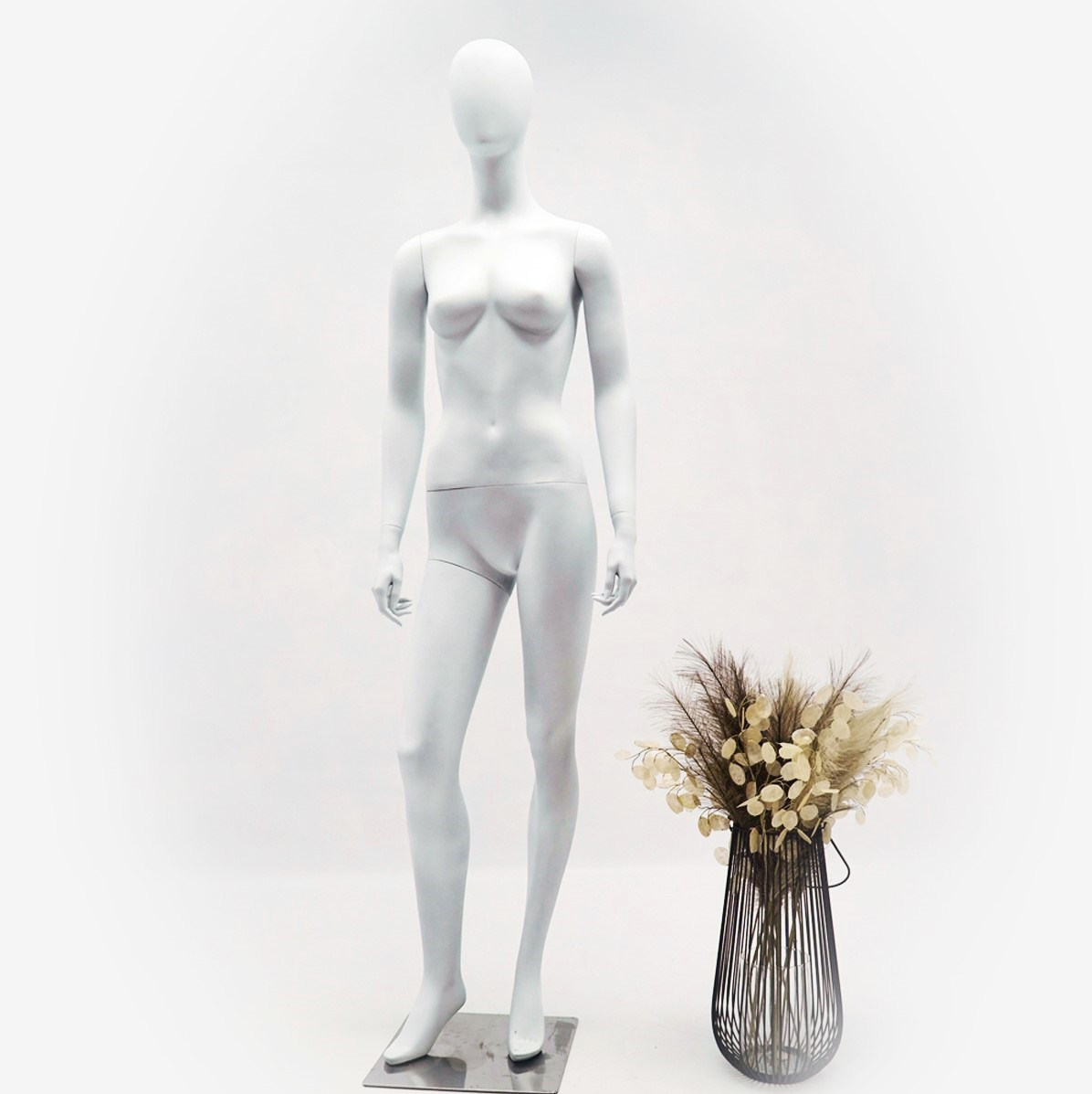Матовий безликий жіночий манекен. Колір - білий. Матеріал виготовлення - ударостійке скловолокно, тому манекен стійкий до пошкоджень і його експлуатація буде довгою навіть при мега-активному використанні. Манекени розбірні, що полегшує процес переодягання і доставки. Підставка в комплекті.